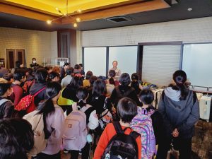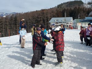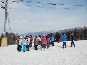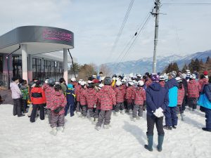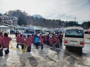 午後からは、夏に八丈の海(底土海水浴場)で交流した木島平小学校の5年生と再会しました。今度は、雪山での遊び方の1つ、そりすべりを通して楽しく活動しました。日本一長いそりコースで、バディの友達と二人乗りのそりも楽しみました。終わりの会では、互いにお土産交換。八丈・青ヶ島からは、黄八丈キーホルダーを、木島平小からは、木島平小の田んぼで収穫したお米いただきました。これからも繋がっていけるとすてきですね。宿に戻り、着替えをして出村式。感謝の気持ちを言葉にし、名残惜しい気持ちをもちながら、帰路につきました。病院へ行くような体調不良者やケガ人もなく、全員で無事に東京へ向かっています。