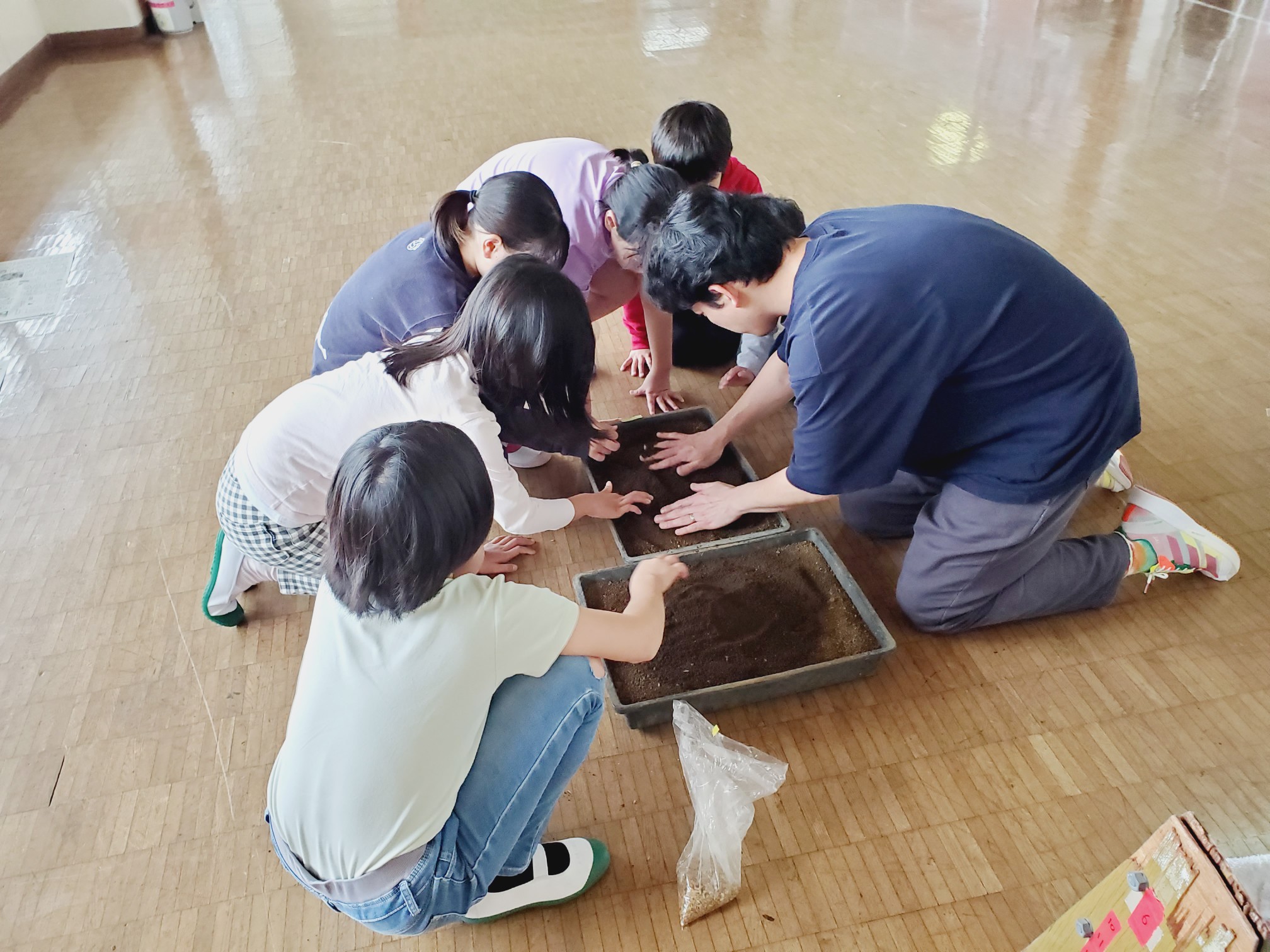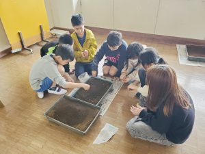 学校日記5(5年 種まき)5年生2024.04.12 朝からあいにくの天候で、雨が降り視界も悪く、朝1便は引き返してしまいました。2便は無事到着しました。今年度も5年生は、1年間米づくり体験をしていきます。今朝、毎年お世話になっている大澤幸一さんから、種まき用の土と種をいただきました。早速、種まき体験をしました。まんべんなくまけるように、慎重にまいていました。今後の成長の様子を観察していきます。