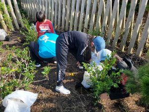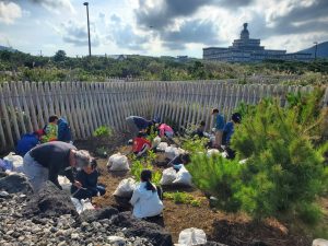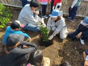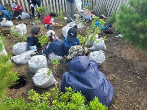 学校日記102(4年 植栽活動)4年生2024.10.03 4年生は、社会科の学習の一環で、中浦保安林(底土キャンプ場の先にあります)で、植栽活動を行いました。八丈島を塩害から守るために、海岸沿いに松林があります。平成17年から八丈支庁の産業課では、子供たちにも体験してもらい、その意義や効果を知ってもらう植栽活動を行ってくださっています。今日も多くの皆様が準備をしてくださり、丁寧に教えてくださいました。今日は、「ハマヒサカキ」「トベラ」の二種類を植えました。この木が子供たちと共に、1年1年成長していく様子を見守るのも楽しみです。