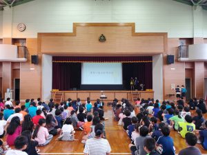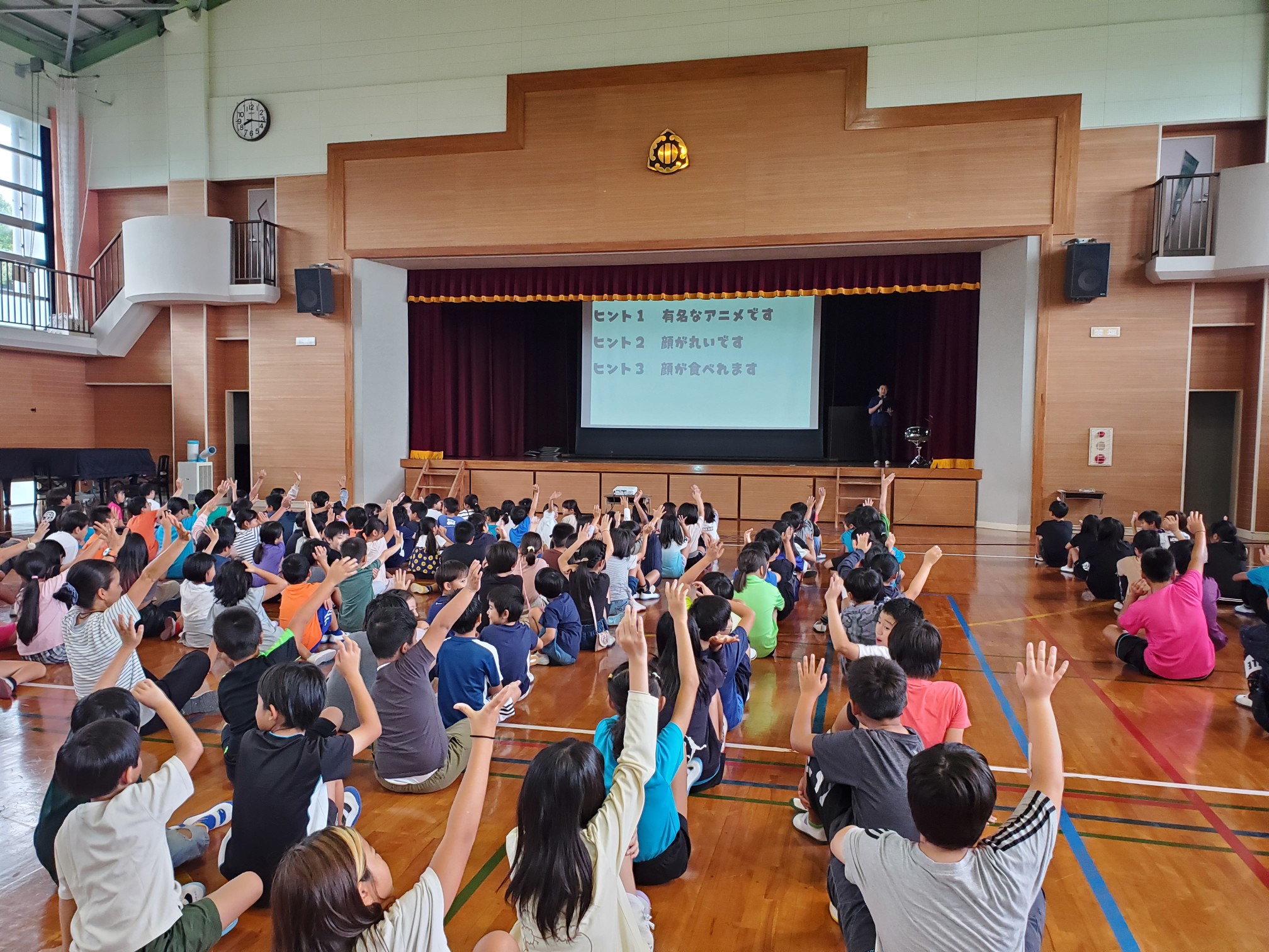 学校日記104(児童集会)三根小だより2024.10.04 今朝の児童集会は、集会委員会企画の「スリーヒントクイズ」集会でした。文字通り3つのヒントから想像したものを当てるクイズです。「①海にいます。②長いです。③島言葉で「なだめ」といいます。」こんなクイズもありました。全部で10問。集会委員のテンポのよい進行に、全校児童が集中して楽しんでいる様子が見られました。(紹介したクイズの答えは「ウツボ」です。)