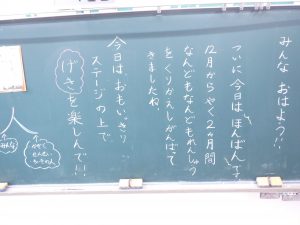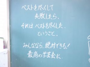 さあ、学芸会が始まります全学年2024.02.03さあ、まもなく学芸会が始まります。会場は、8時30分。スタートは、8時40分です。お待ちしています。 担任の先生方から、朝登校した子供たちへのメッセージです。