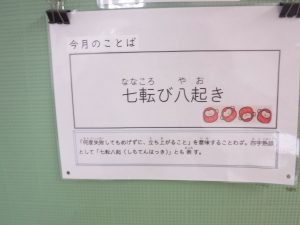七転び八起き全学年2024.02.08今月の目標は、「七転び八起き」です。失敗しても起き上がればいい。学芸会で、校長先生が「失敗したっていいんだよ、思い切ってやってください」。子供たちは、校長先生をはじめ先生方の支援で、自分を出せていまのではないでしょうか。「失敗は成功の素」ともいいます。 5年生の作品が展示されています。