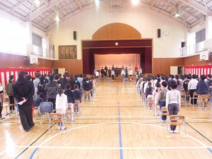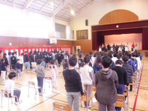 卒業式練習 気持ちを込めて全学年2024.03.12まもなく、温暖前線が通過します。南風が強くなっていくものと思われます。そして、今夜寒冷前線が通過します。夕方は荒れ模様となるでしょう。さて、卒業式練習のリハーサルのリハーサルを行いました。決め事あり、呼びかけあり、歌がありと確認しながら進められました。「緊張して間違ってもいいよ。」「気持ちを込めてやってくれればいいよ。」と話しました。温かい気持ちのこもった卒業式になるでしょう。