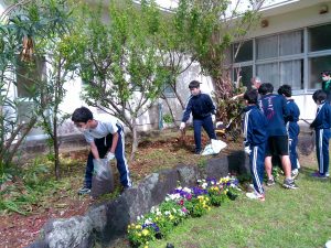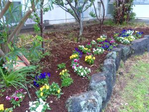 卒業式、入学式で各先生方が手入れをし、生き延びていたスミレの苗を植えました。